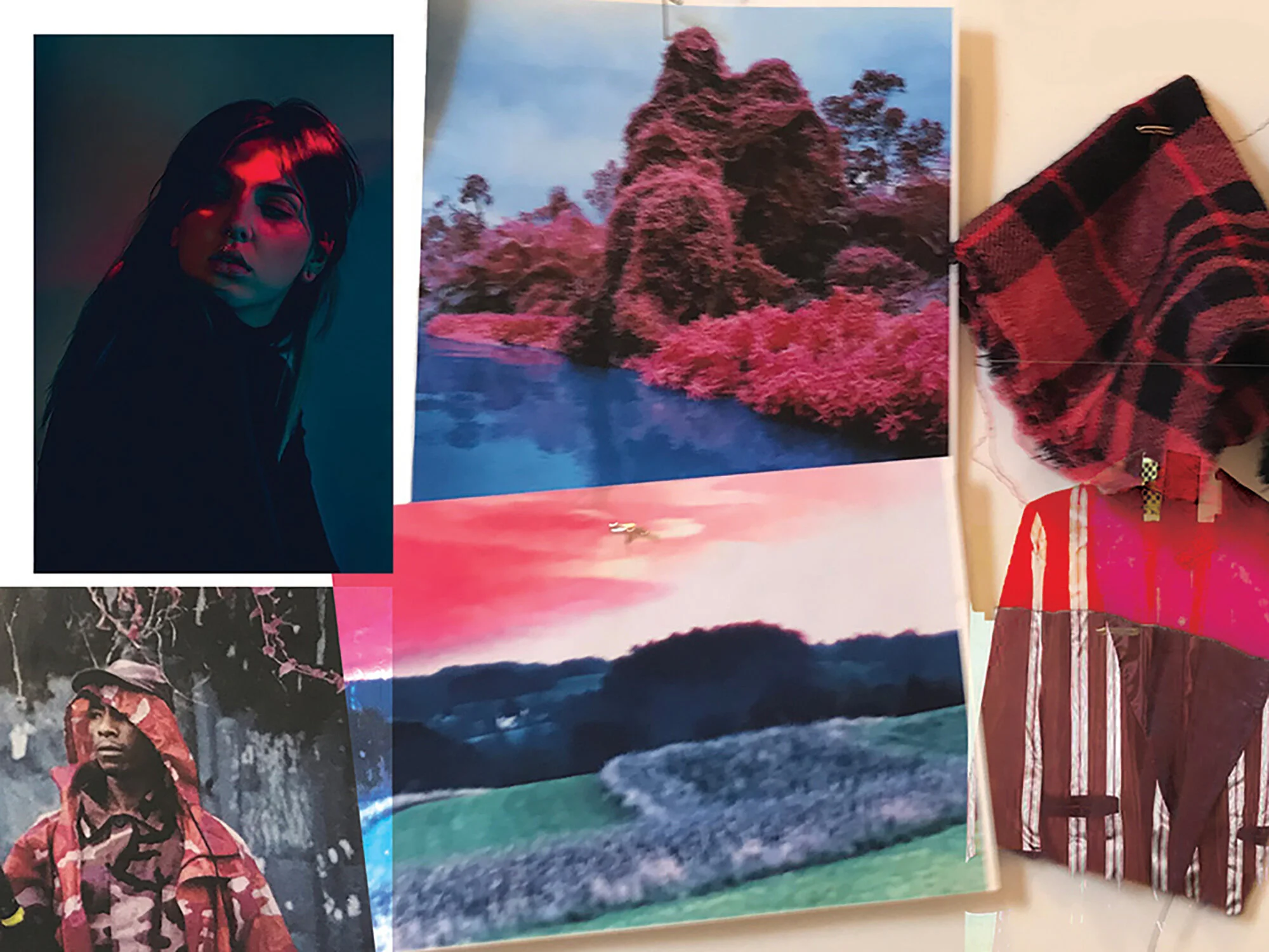 Seasonal inspiration images for color palette and fabric development including infrared photography by Richard Mosse.